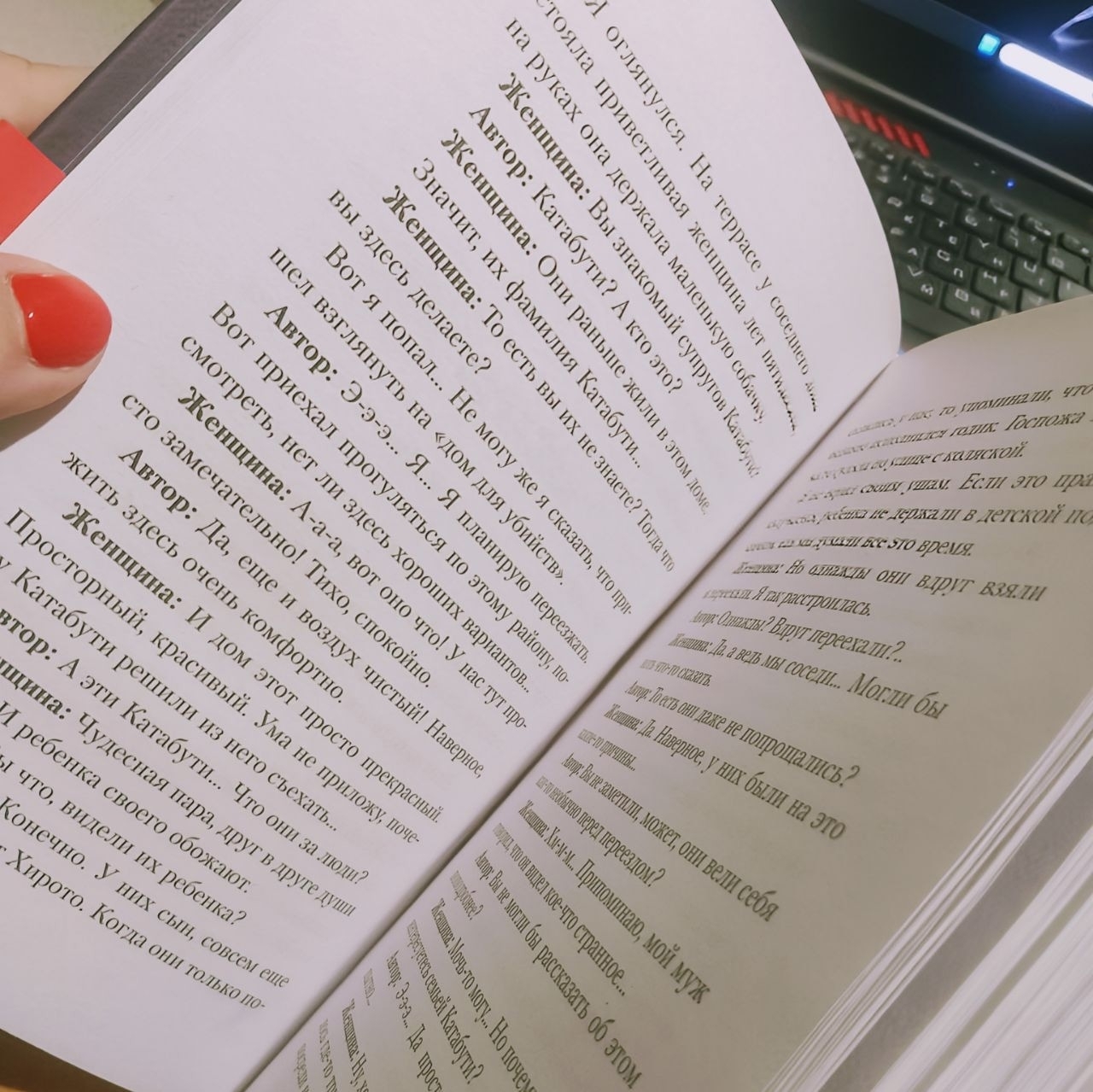Так вот, о чём я. Мучилась я, значит, с избеганием тавтологии в авторском тексте, считая, что судьба моя такая, пока не начала читать «Странный дом» Укэцу и не увидела то, что вы можете наблюдать на фото. Автор просто сделал диалоги как в пьесе, совершенно не заморачиваясь всем вышеперечисленным!
